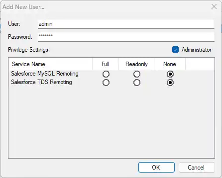 Navigate to the Users tab and click Add to create and configure a new user. Apply permissions for each service created. Or, select the Administrator option to allow the user to have full access to all services.