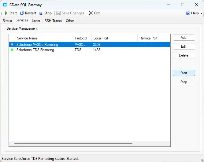 Once the services, users, and Gateway are configured, you can start your remoting services. Navigate to the Services tab, select a service, and click Start.