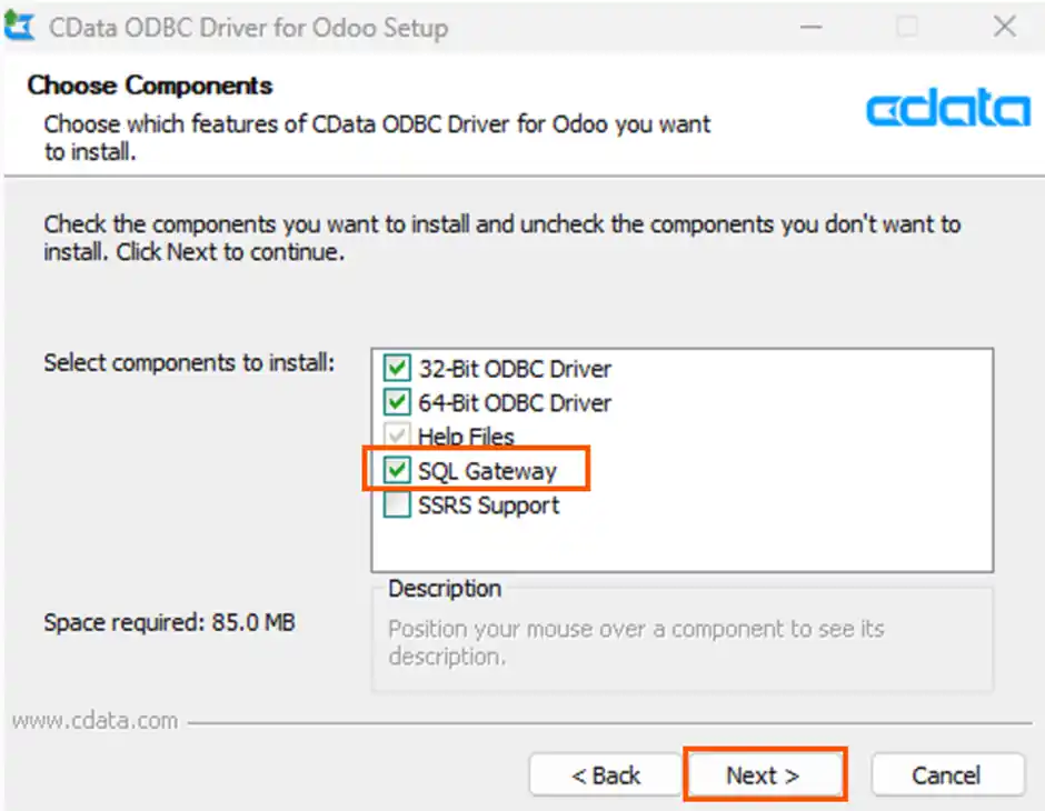 The SQL Gateway can be installed through a separate installer (download here) or as part of the installation of a CData ODBC Driver. If installing with a CData ODBC Driver, be sure to check the "SQL Gateway" checkbox when running the installer.
