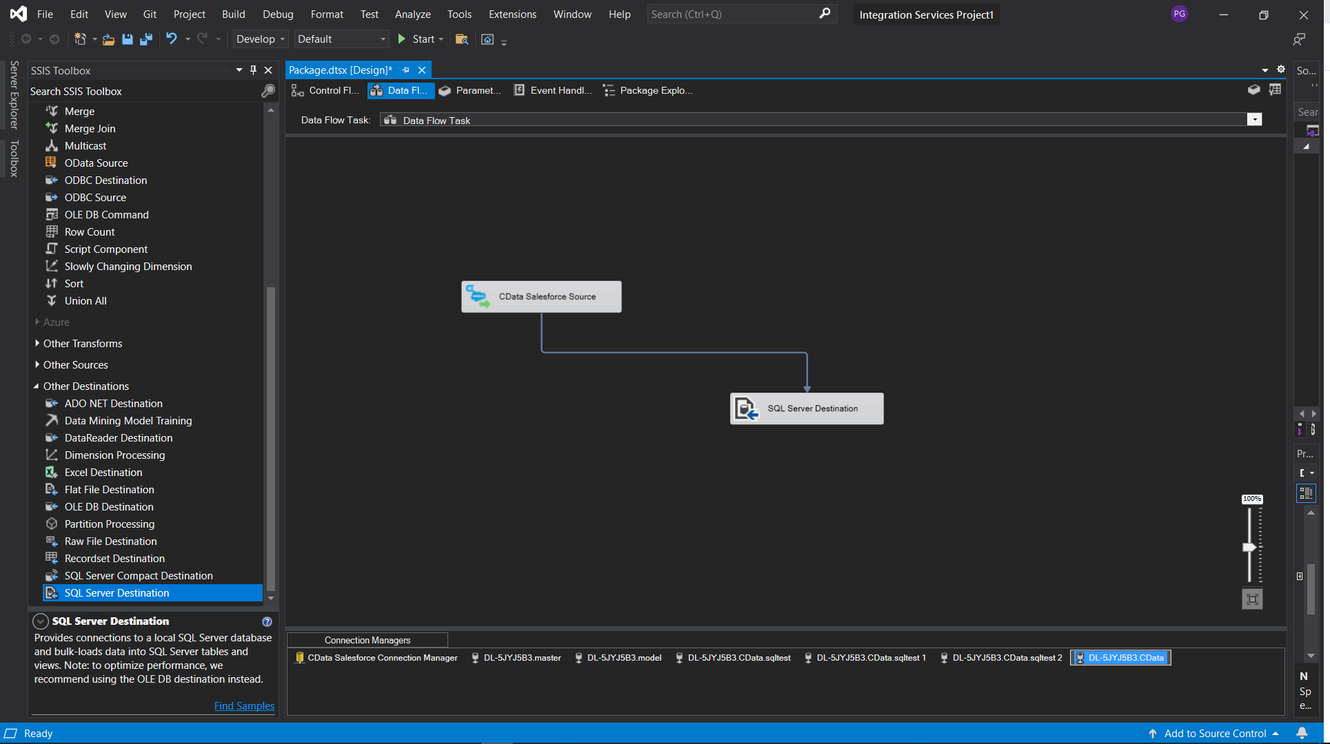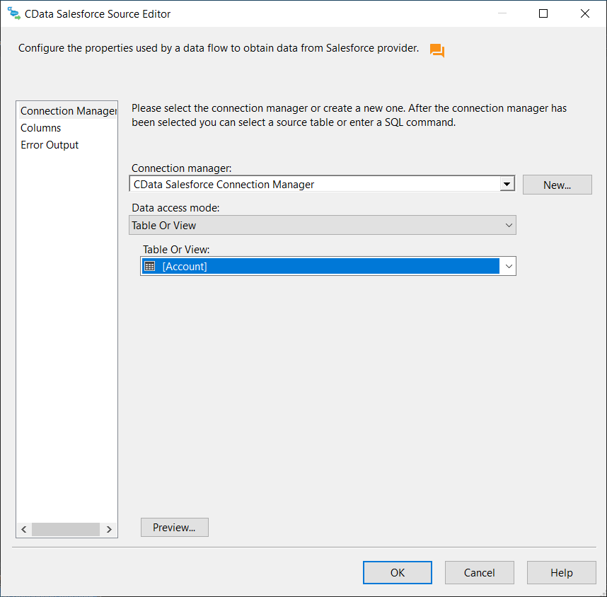 This example demonstrates how to use the CData SSIS Component for Salesforce inside of a SQL Server SSIS workflow to transfer Salesforce into a Microsoft SQL Server database.