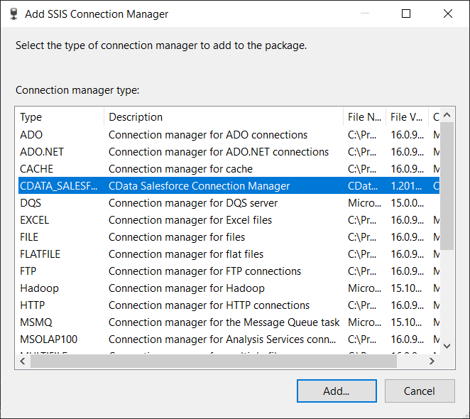 Then, select CData Salesforce Connection Manager from the list and click Add...