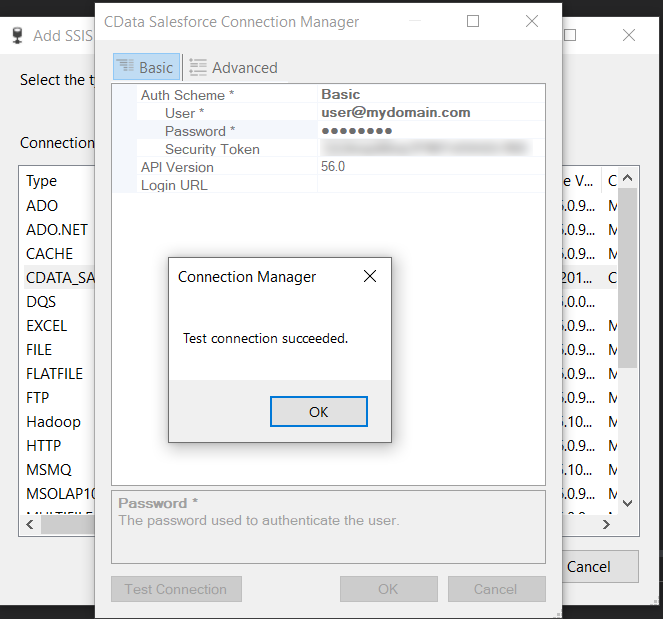 Choose Basic for the Auth Scheme and enter your connection information. Next, click Test Connection. Click OK.