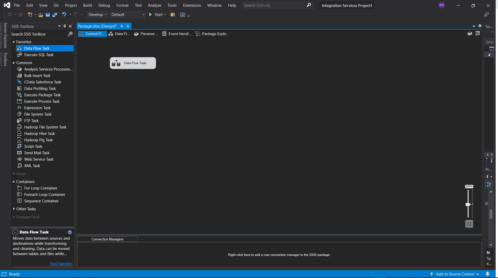 Next, drop a new data flow task into the package.