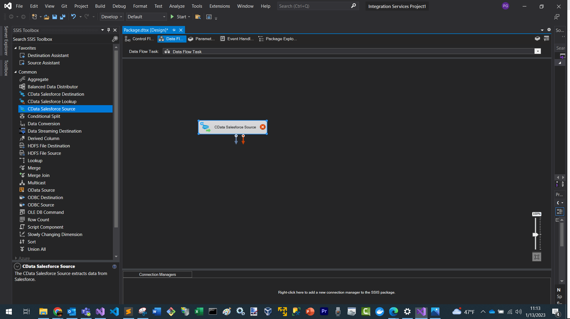 In the data flow task, drop a CData Salesforce source component.