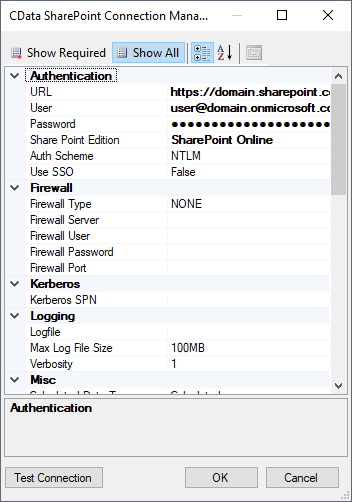 - In the CData SharePoint Task Designer, add a new Connection Manager and add your credentials for the SharePoint site.