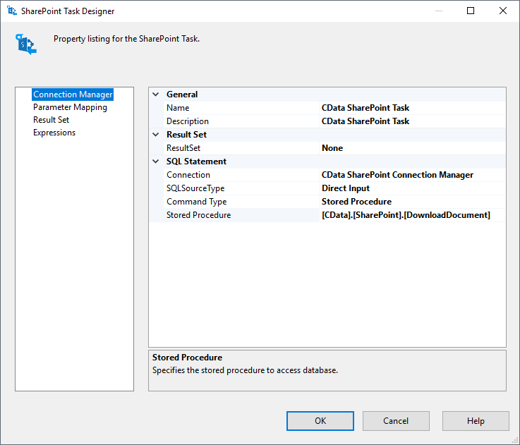 - Set Stored Procedure to the desired stored procedure to execute. For example, [CData].[SharePoint].[DownloadDocument]