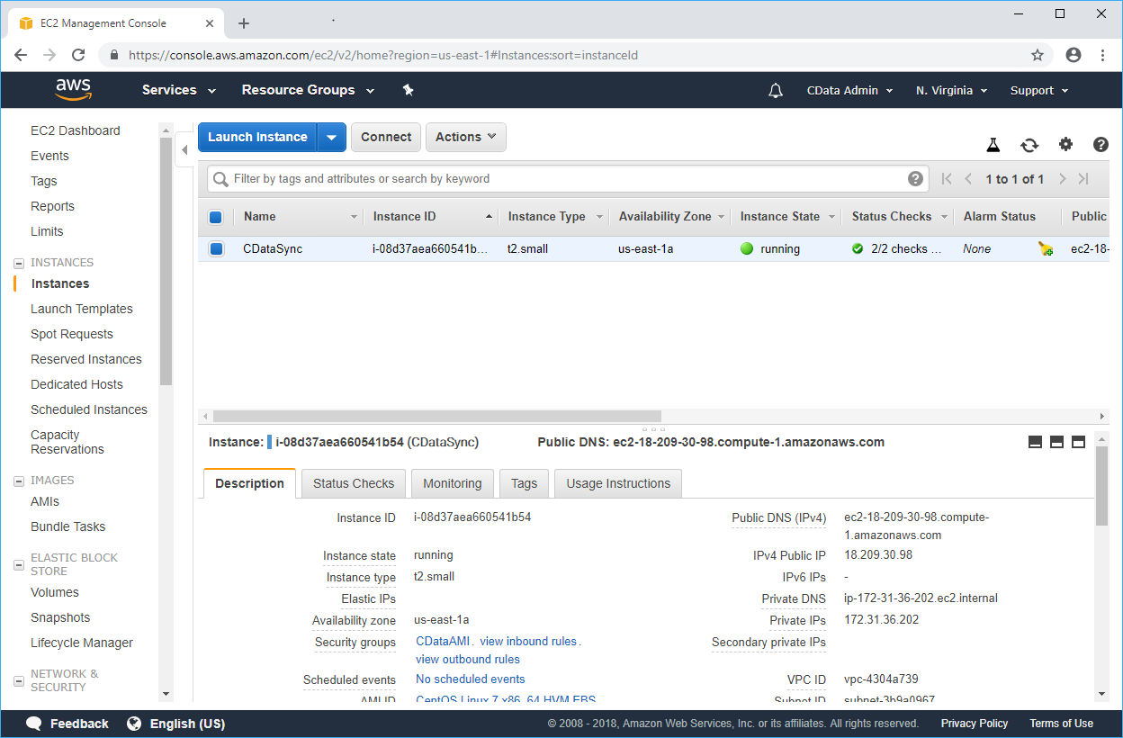 Once the instance has launched, it will be listed in your instances running EC2. You can then access CData Sync in your browser at the URL: