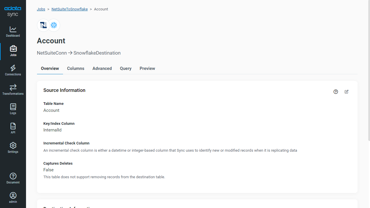 - Next, click on the lone table and change its Table Name. The Incremental Check column is used to determine which records have changed and thus replicated since the job last ran. In addition, we can specify our destination table name, either creating a new table in the destination or selecting an existing one.