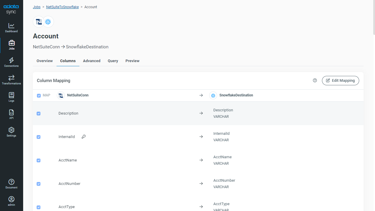 - The Columns tab allows us to include and/or exclude any columns from our replication job. Also, this tab allows you to map the source columns to the appropriate destination columns, which may have different names.