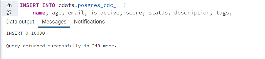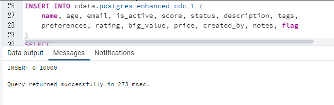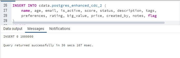 Next, we created a non-target table named postgres_cdc_2 and inserted 1 million records into it.