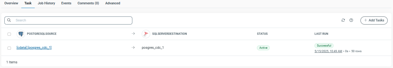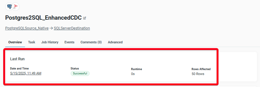 The initial job for postgres_cdc_1 was executed, successfully replicating the initial 50 records.