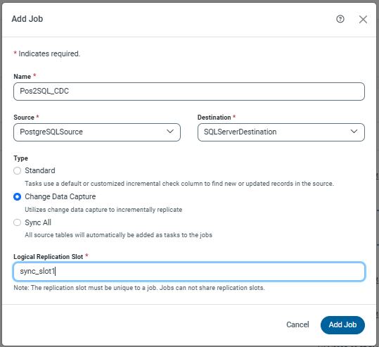 We then proceeded to create a change data capture job, specifying this replication slot.