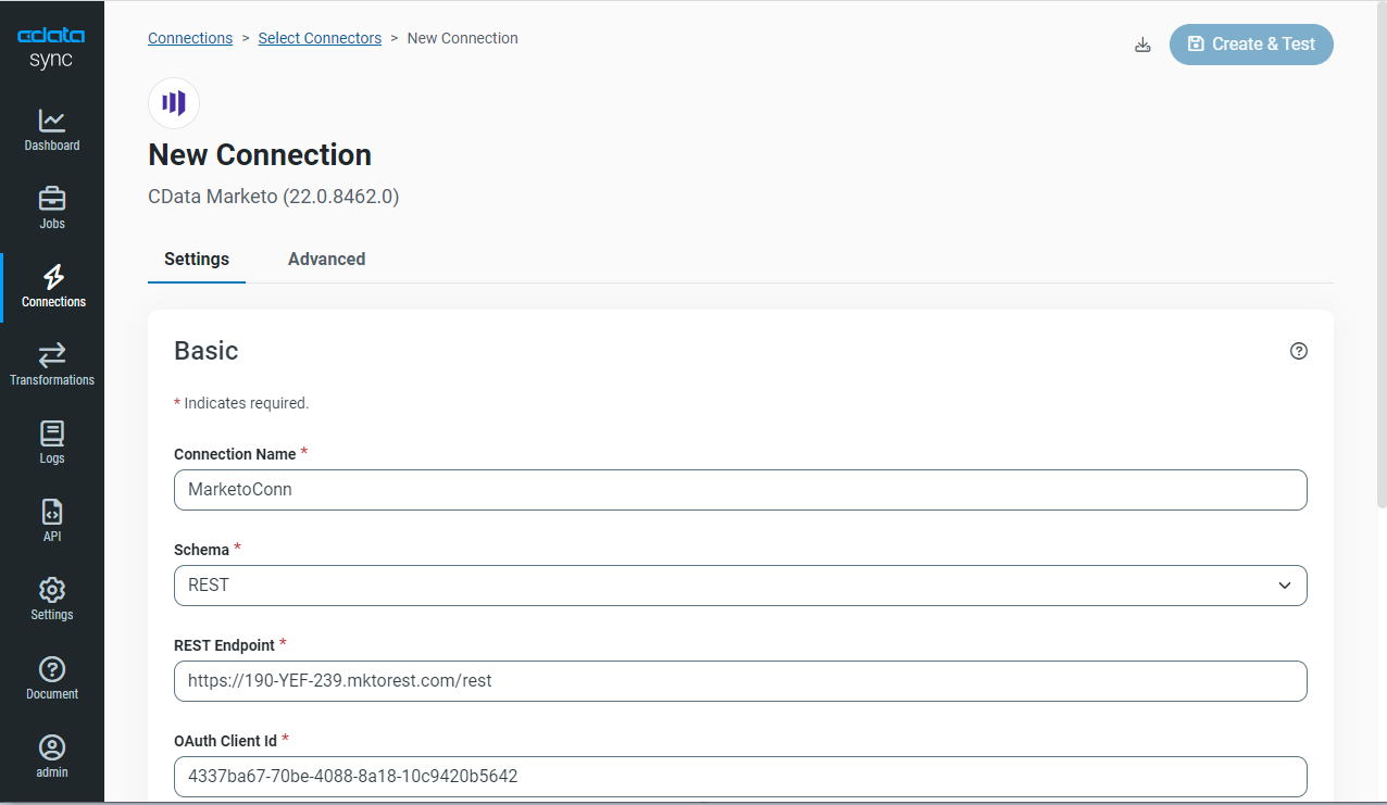 - On the Connections tab, click + Add Connection, then Sources, then select Marketo. Then enter the connection properties specific to your Marketo account.