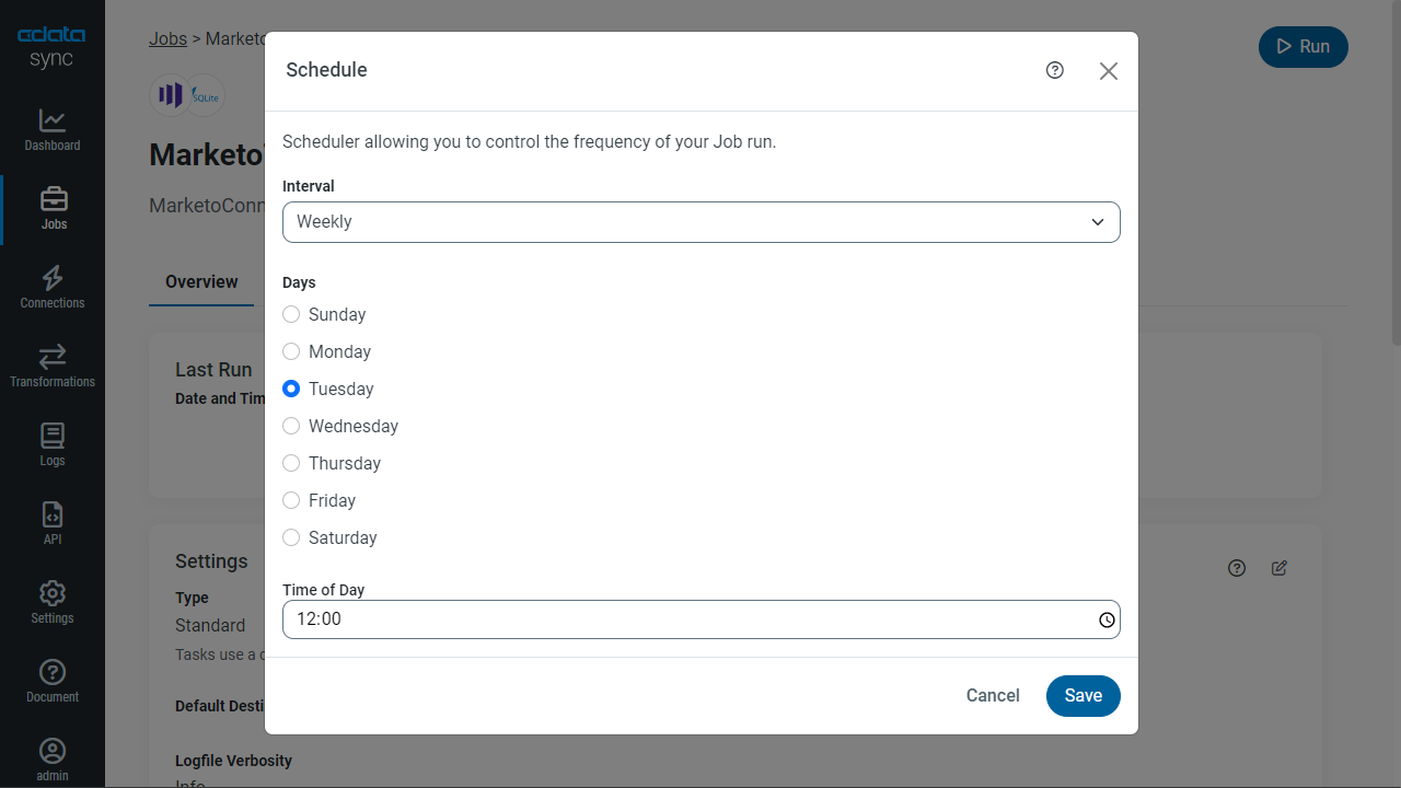- On the Overview tab of the job, click Configure from within the Schedule section. Select an Interval and Minutes Past The Hour and click Save.