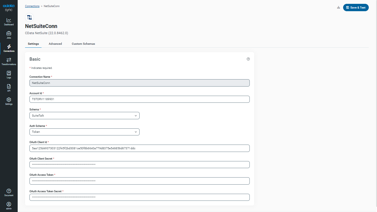 Connecting to any given data source in CData Sync requires knowledge about the service, database, or application, like a server URL or credentials. In many cases, CData Sync uses OAuth to authenticate your account directly with the data source via your web browser. To connect with NetSuite, navigate to the Connections tab, click Add Connection, and select NetSuite from the Source section.