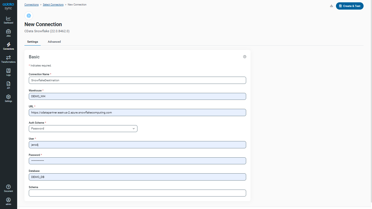 Set the User and Password properties to valid Snowflake user credentials. Set Account to the Snowflake account and set URL to the URL of the Snowflake instance (i.e., https://myaccount.snowflakecomputing.com). Last, set Database on the main Settings tab and Warehouse and Schema on the Advanced tab to the corresponding Snowflake values.