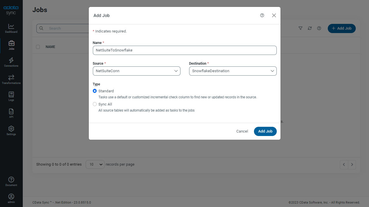 CData Sync uses SQL queries to replicate data, so each entity, folder, bucket, etc. is treated as a table, replicating the columns and rows to the replication database. To create a new replication job, navigate to the Jobs tab and click Add Job. Select the configured NetSuite connection for the Source and the configured Snowflake connection for the Destination. You can choose to replicate entire tables by clicking Add Tables.