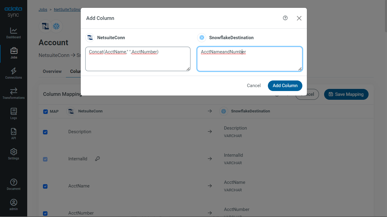 CData Sync also supports extract-transform-load (ETL) functionality. With the Transform feature, you can customize your replication by selecting specific columns (fields), filtering data, creating aggregations, and more to replicate exactly the data you need — even perform operations on the data before it is pushed to the replication destination. For example, using the Transform feature, you can change the name of the replication table and concatenate the fields AcctName and AcctNumber:
