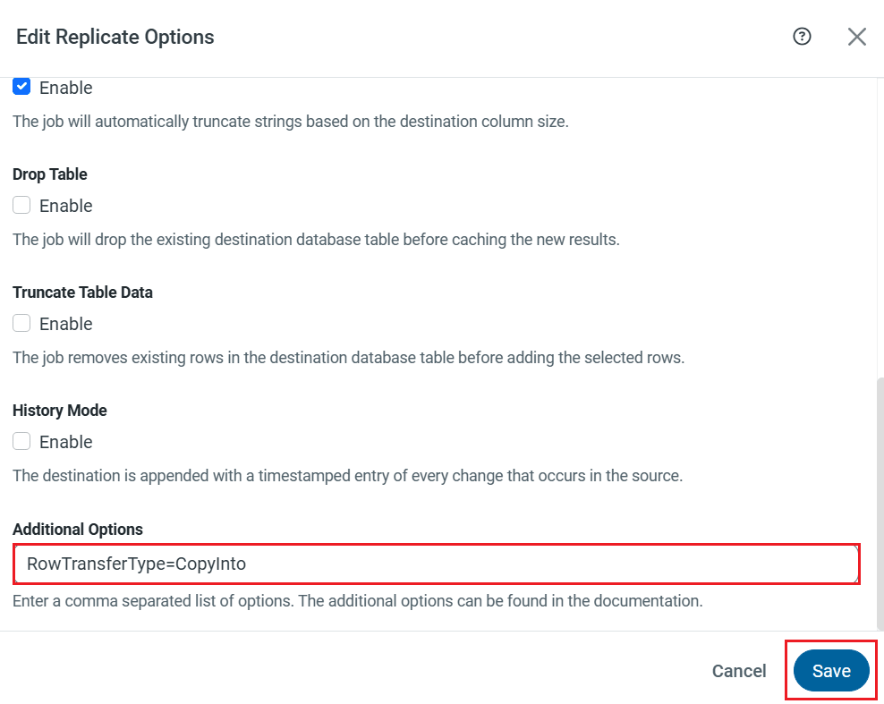 After completing the update, configure the job settings. Open the replication job targeting Snowflake and, under the Advanced tab in the task, edit the Replicate Options, and set the following property in the Additional Options section: