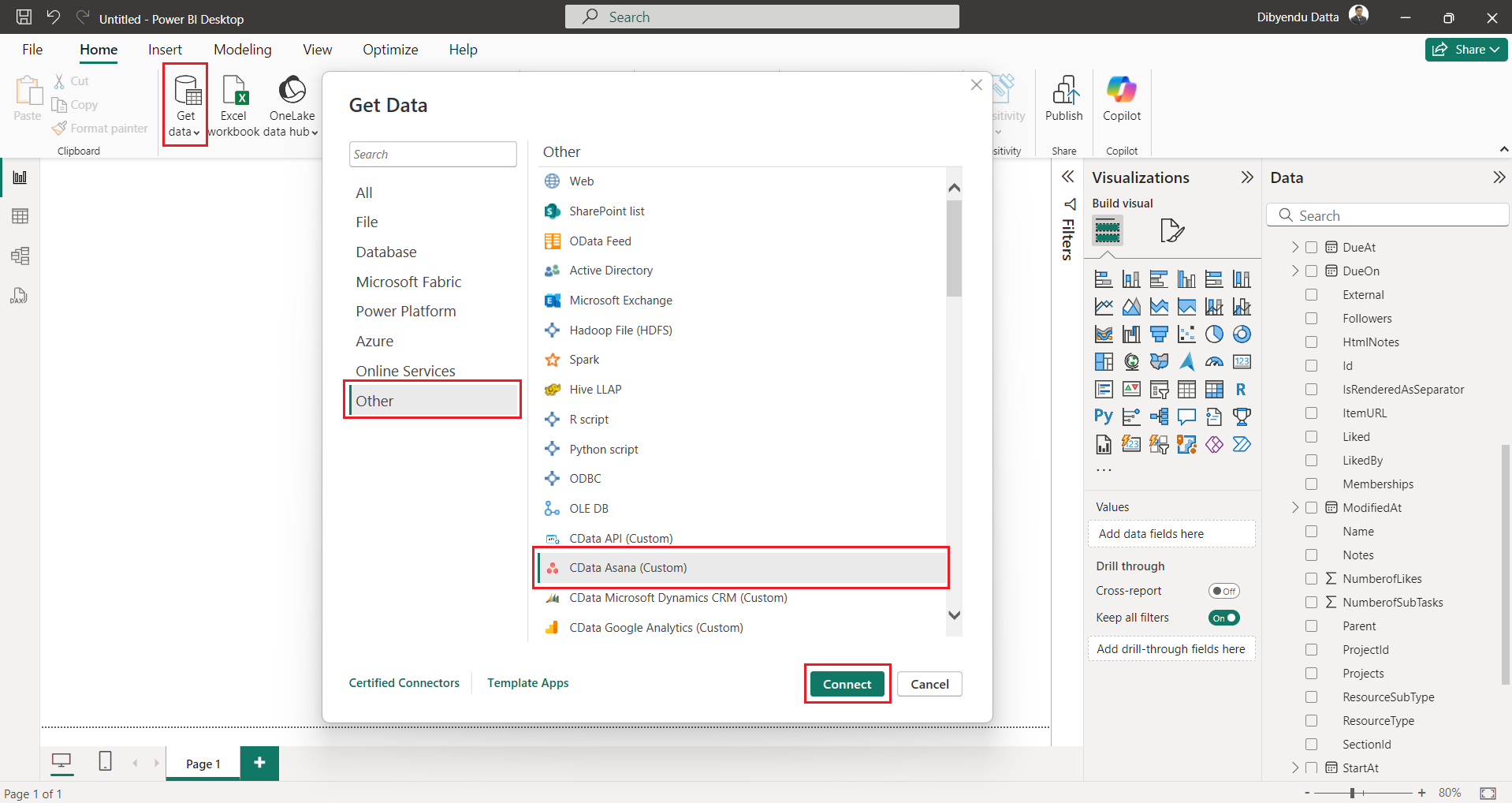 - Open Power BI, navigate and click on Get data > Other > CData Asana (Custom).