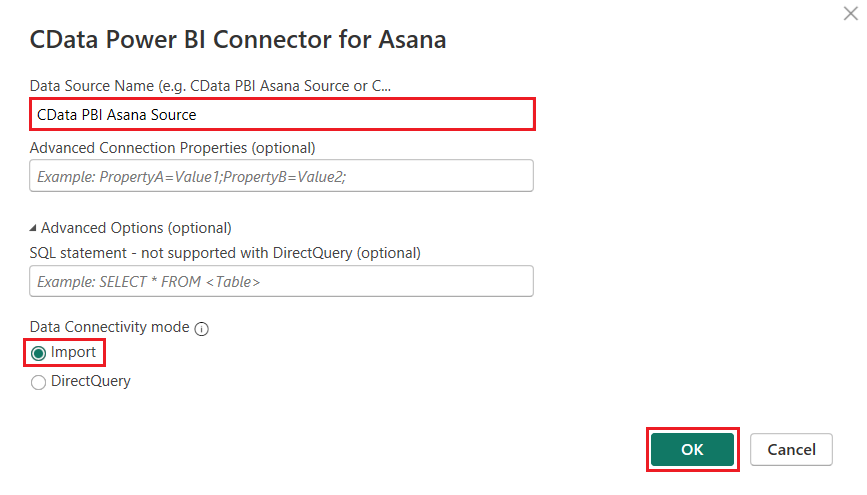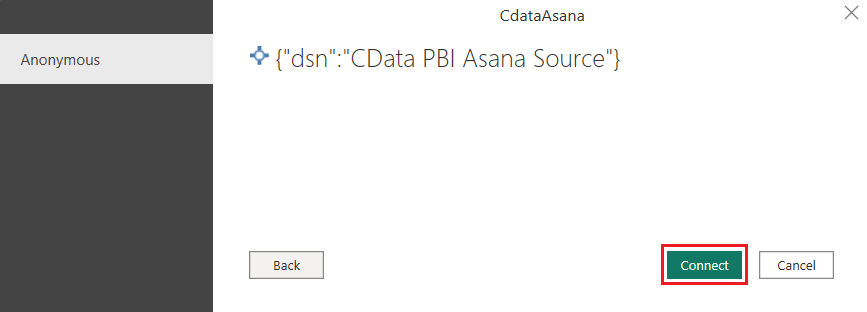 Click OK to complete the connection. Note down the DSN or Data Source Name (the default is "CData PBI Asana Source") as you will use it in the next section.