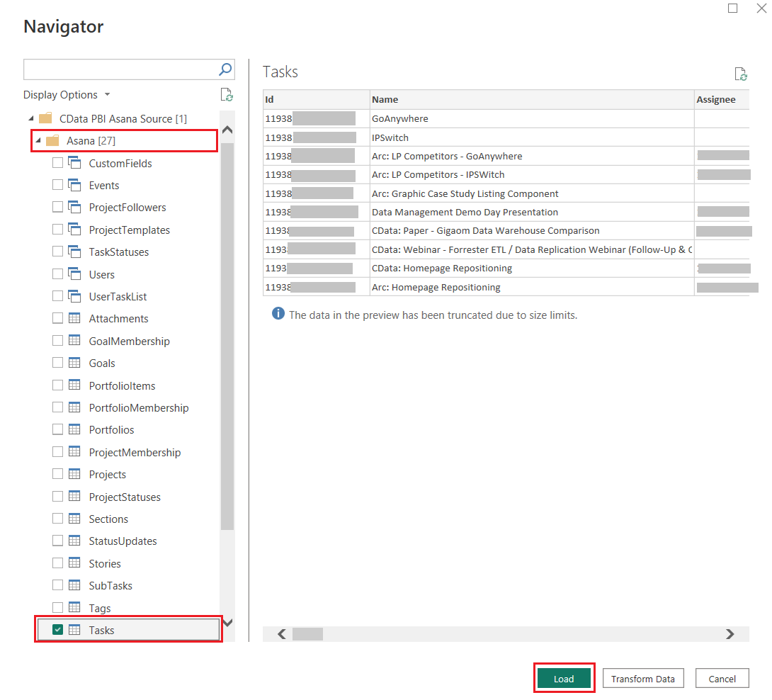 - Asana data is displayed in a table format, making it ready for use in Power BI. Select the object you wish to work with and continue. For this example, we selected the "Task" table and click Load.