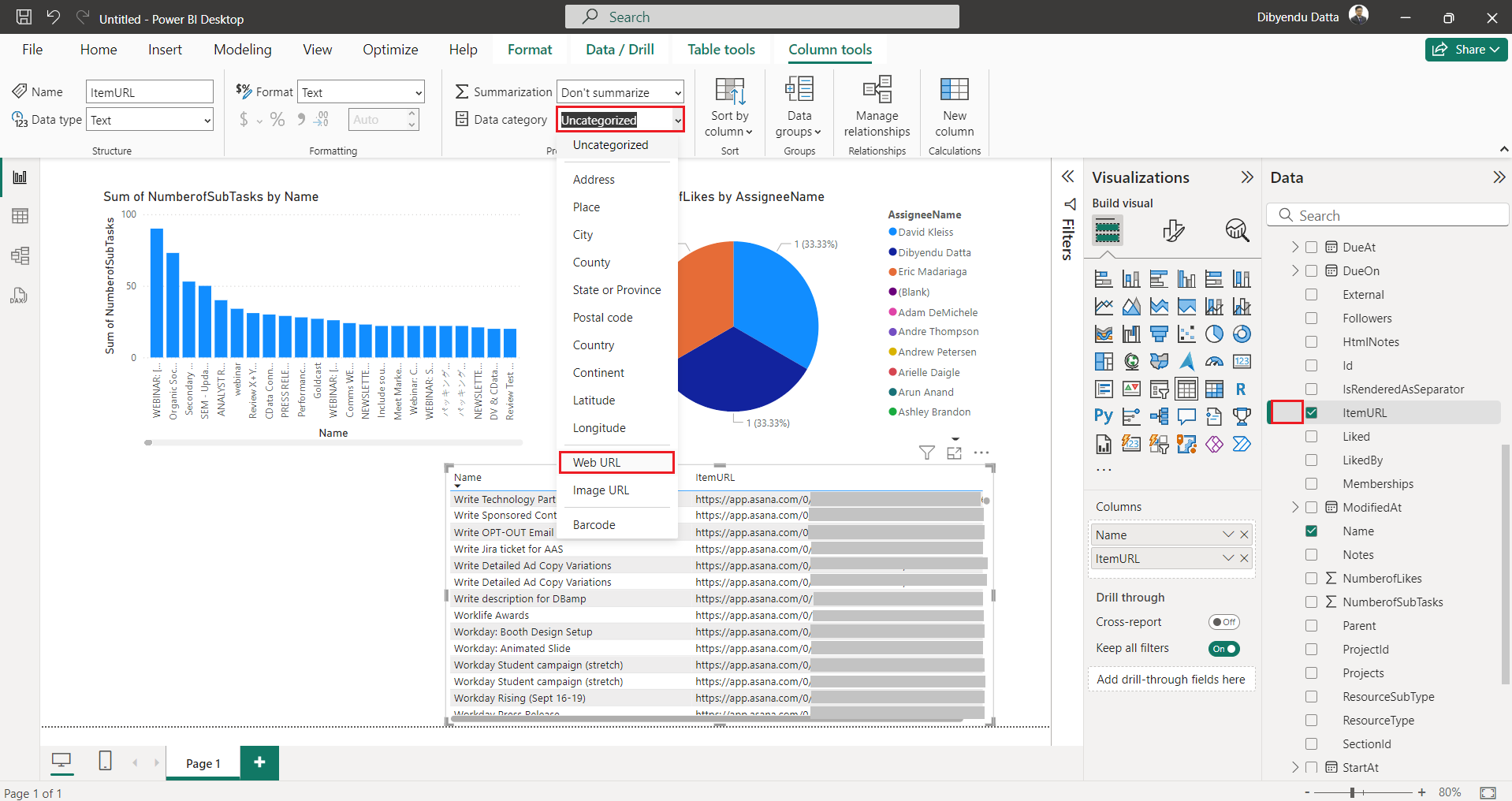 - In the "Task" table, you will find a column named "ItemURL," which contains the URL that links directly to the Asana screen. To format it as a clickable web link, click on the column entity in the Data pane at the right. Then, from the drop-down menu on the top ribbon, select "Web URL" as the data category. This will convert the plain string into an active web URL in the report.