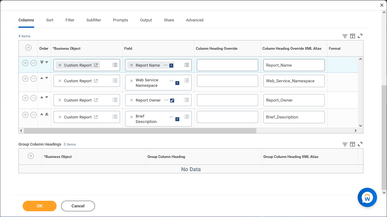 - Add 4 Columns: Fields, add Report Name, Web Service Namespace, Report Owner, and Brief Description.