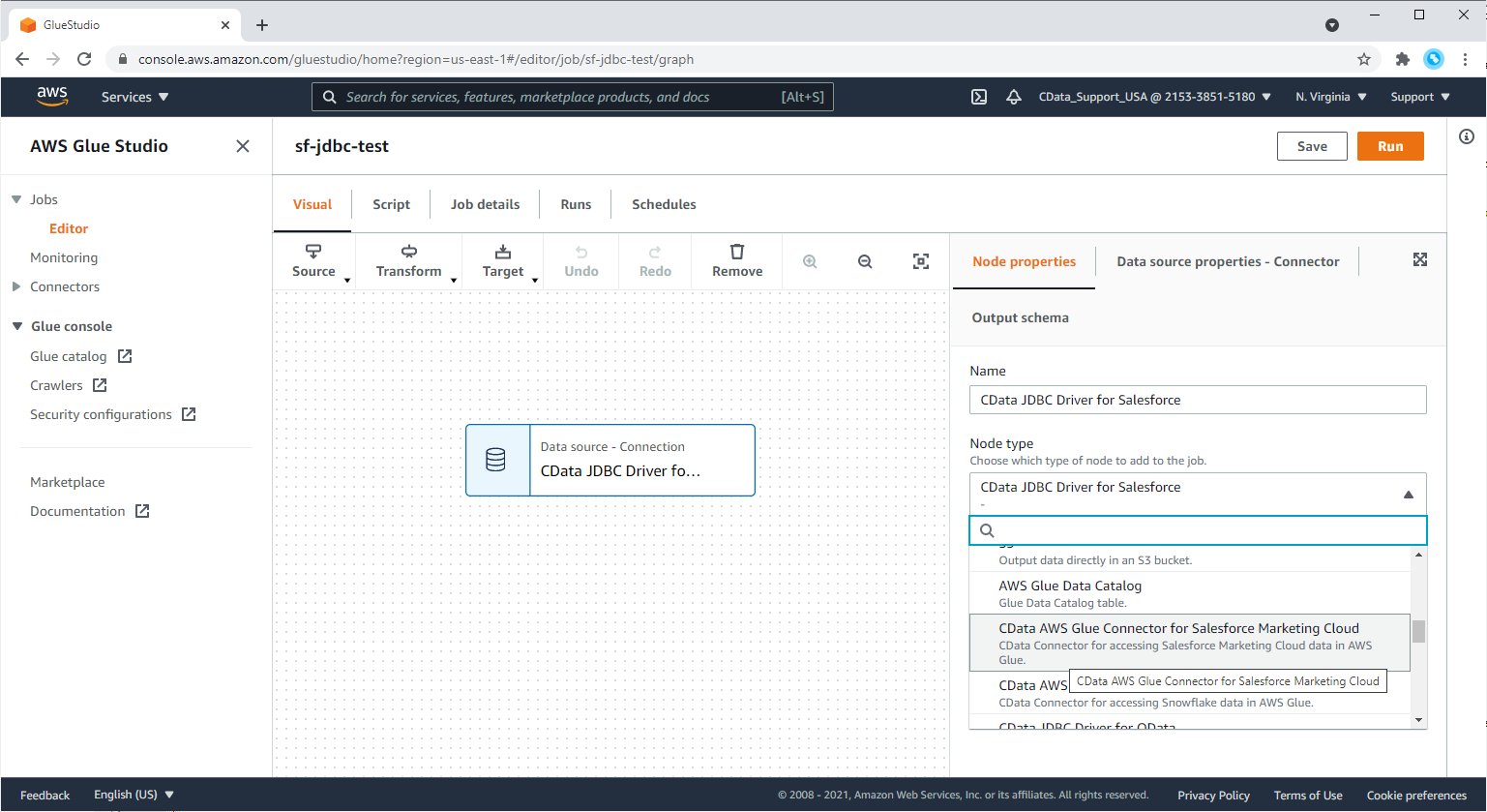 Once you have tested the connectivity and its use in AWS Glue Studio, you can subscribe to the AWS Glue Connector. We have a full deployment guide for the CData AWS Glue Connector for Salesforce, but the principles apply to any of the CData AWS Glue Connectors. Once you have deployed the CData AWS Glue Connector and configured a connection, you can open your Glue Job, select your source node(s) that use the Custom Connector, and change them to use the CData AWS Glue Connector and the corresponding connection.