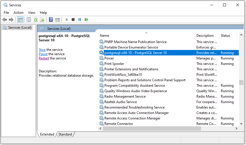 - In the list of currently running services, find the service for your PostgreSQL server and restart it. Doing so will apply the changes you made in the conf file to the PostgreSQL server.