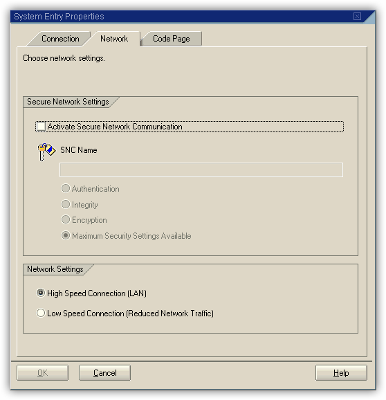 In addition to the required connection properties on the Connection tab, your connection to SAP will require secure network connection (SNC) properties. You can obtain the following SNC connection string properties on the Network tab: