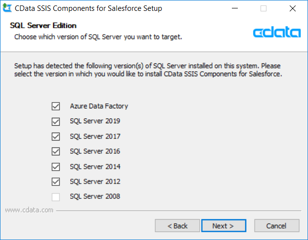 When installing the CData SSIS components, available versions of SQL Server are detected on that specific machine, and the user is given a choice of which assemblies they would like to install.