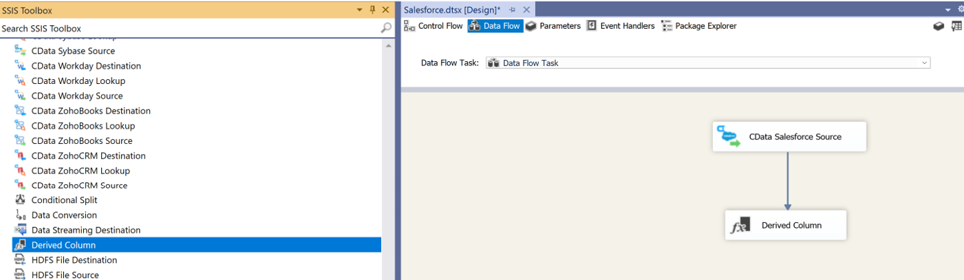 - Drag a Derived Column transformation component from the Data Flow Transformations section of the toolbox onto the data flow.