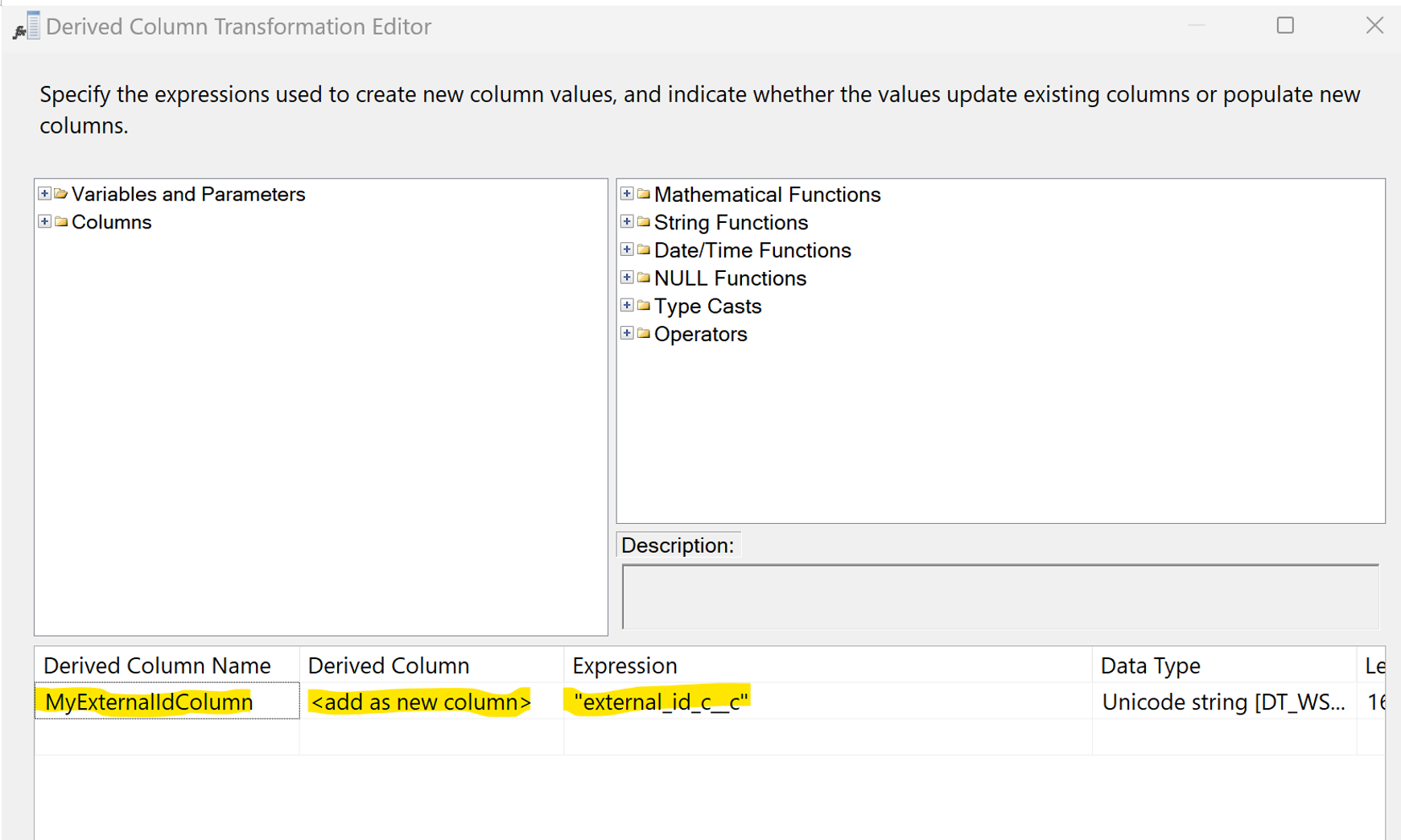 - Double-click the Derived Column to open the Transformation Editor and add a new column. Set the Derived Column Name to the name of the new column (MyExternalIdColumn in this example). Select the "add as new column" option in the Derived Column field. Set the Expression field to the name of the external Id column in the Salesforce destination table, including quotes. This example uses "external_id_c__c".