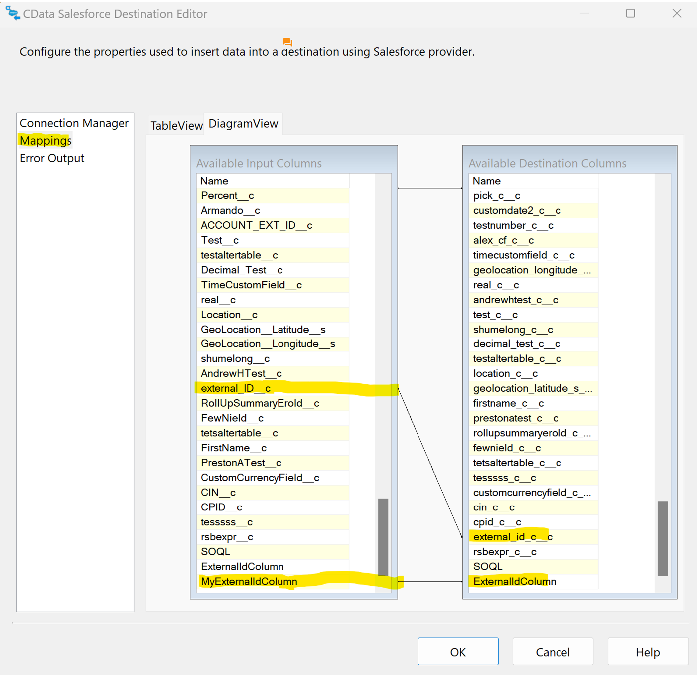 - In the Salesforce destination component, specify the table that will be used for the upsert operation (i.e., the destination table). In the mapping section, map the derived column that you created in step #3 (in this example, MyExternalIdColumn) to "ExternalIdColumn" pseudocolum mentioned in step#4. Additionally, map the column from the source table to the Salesforce external id column of the destination table. In this example, we mapped the "external_ID__c" from the source to "external_id_c__c" in the destination table.