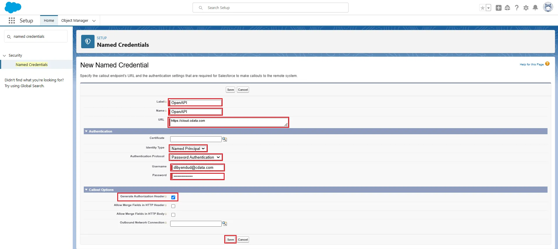 - Add the given details in the New Named Credential screen: