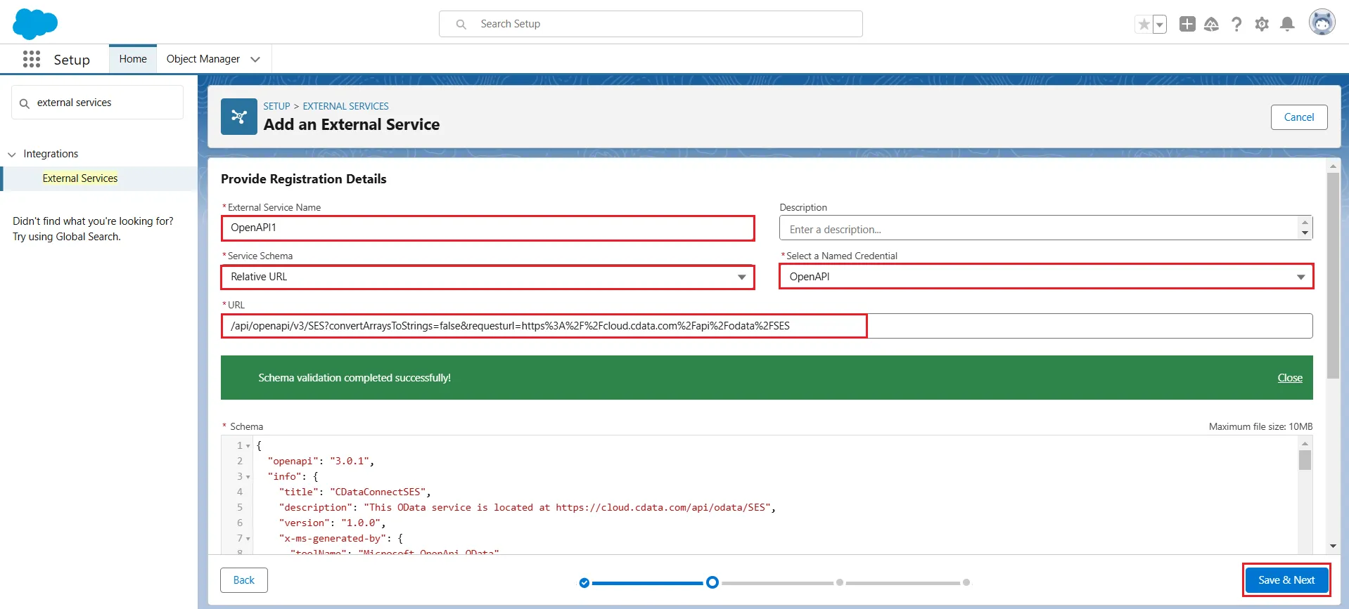 If the connection is successful, the message "Schema validation completed successfully!" will be displayed on the screen. Click Save & Next