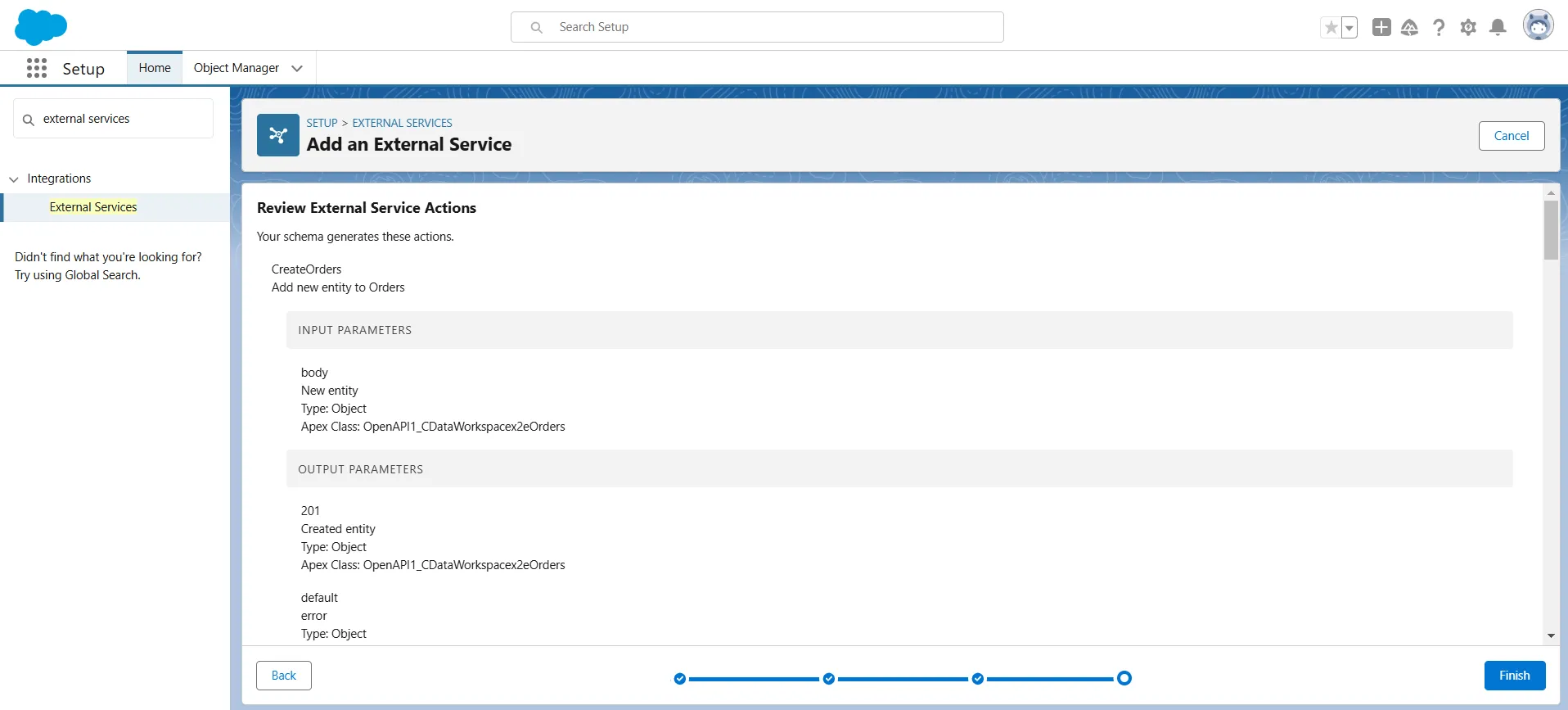 - All the schema-generated actions are displayed in the Review External Services Actions screen. Click Finish.