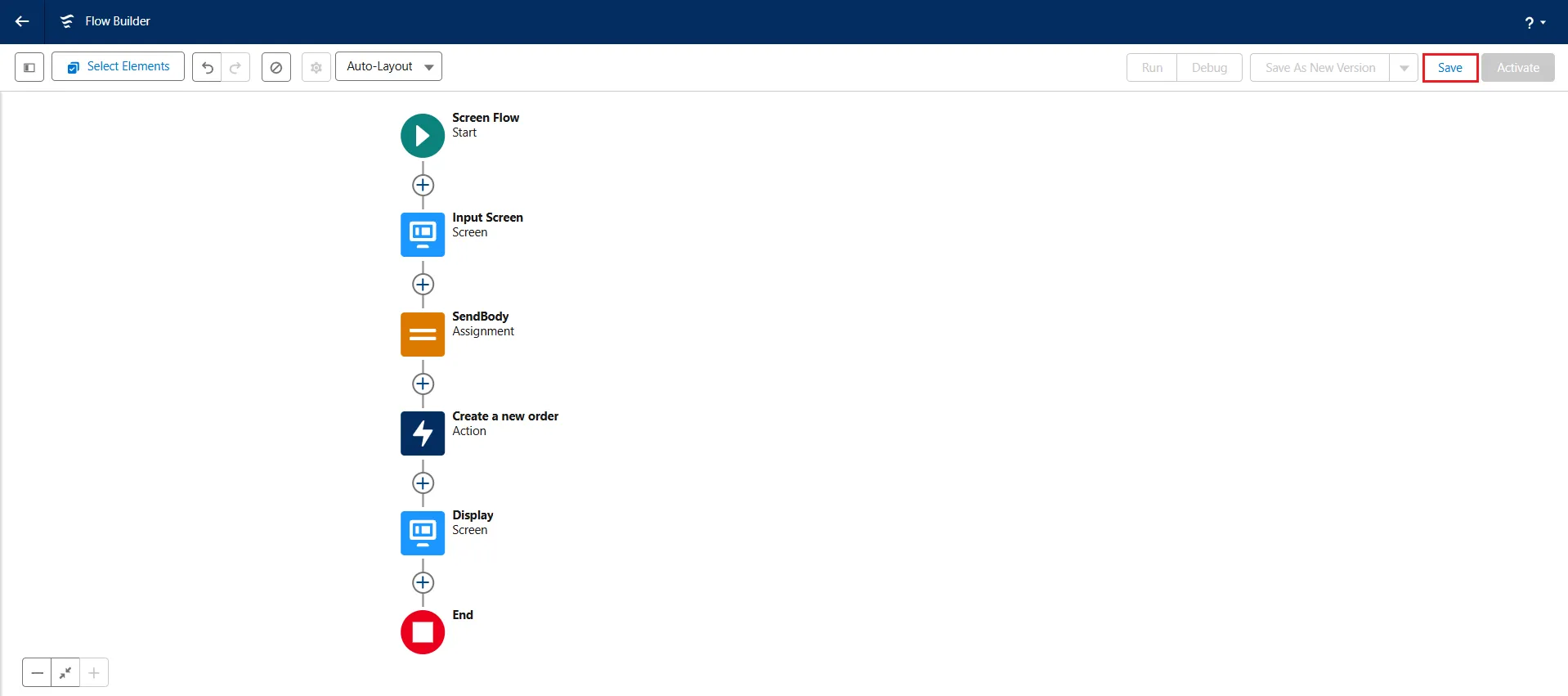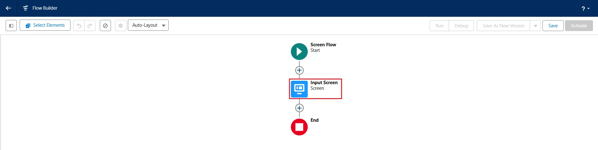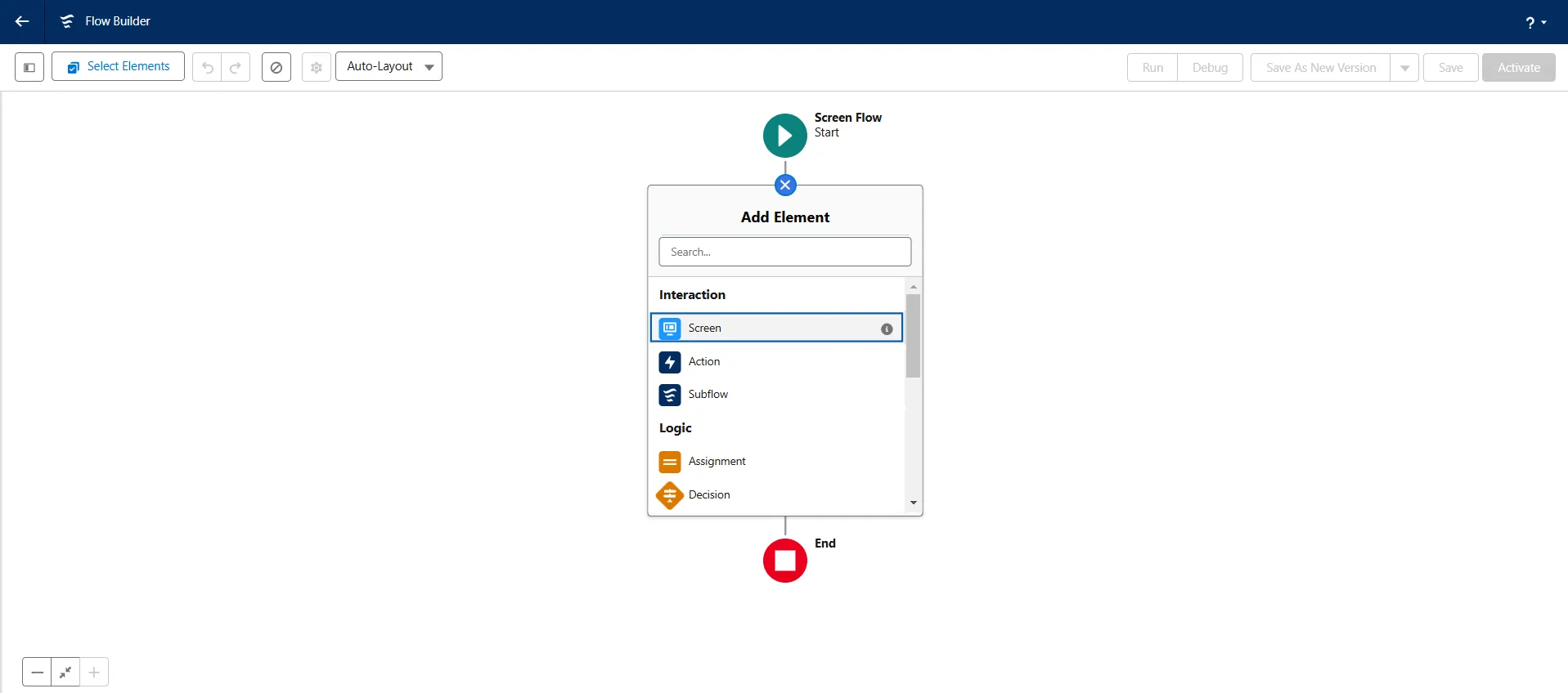 - In the Flow Builder screen, click on the "" between Screen Flow and End.