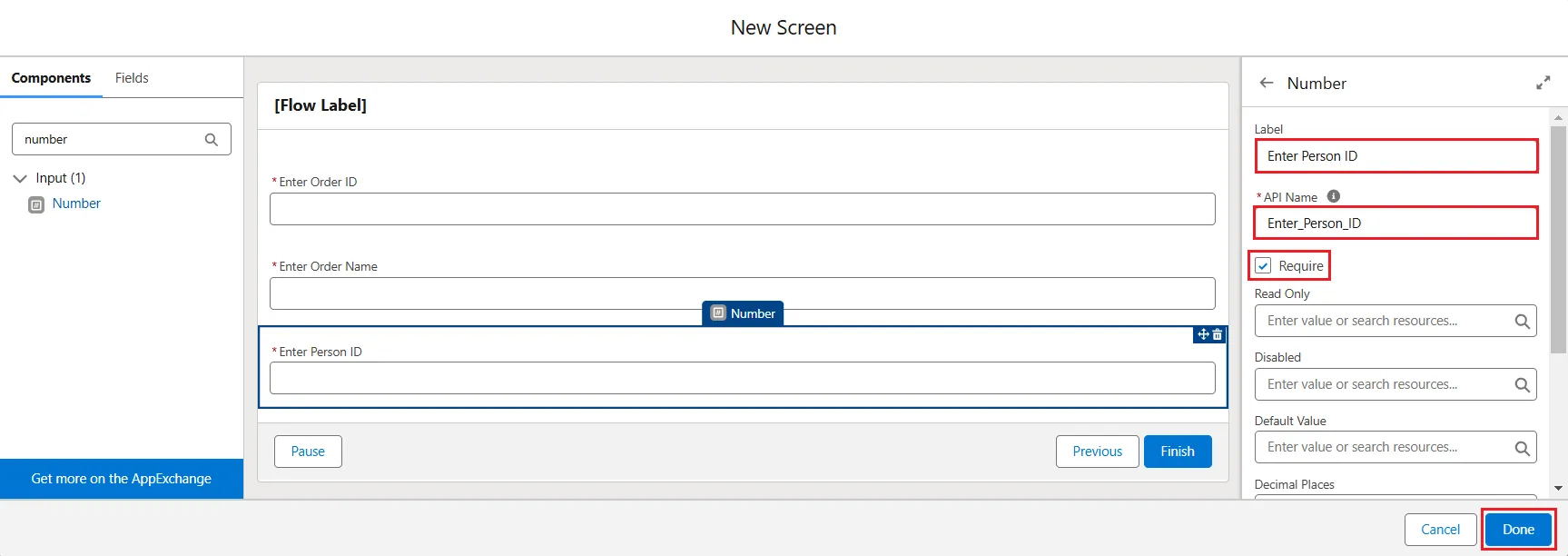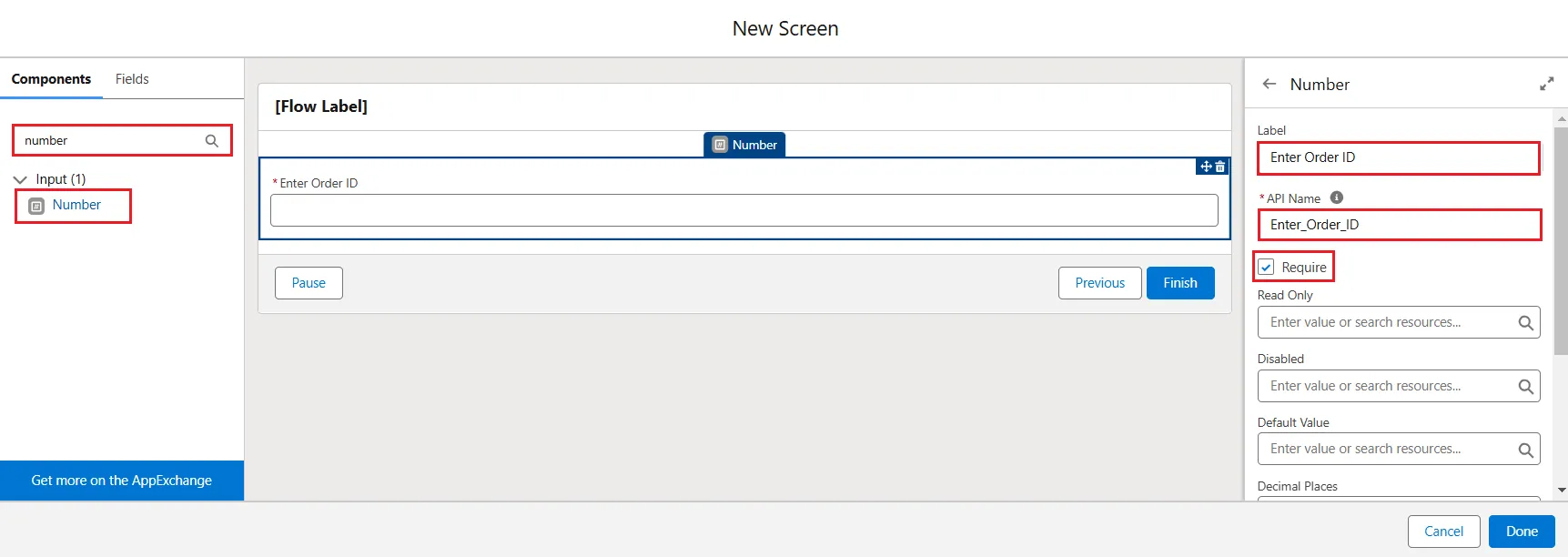 - Now, for the orderid column, search for the "Number" component in the Components search bar and click on it. Enter Label as "Enter Order ID" and again API Name will be auto-filled accordingly. Enable the Require checkbox and apply this for steps 9 and 10.