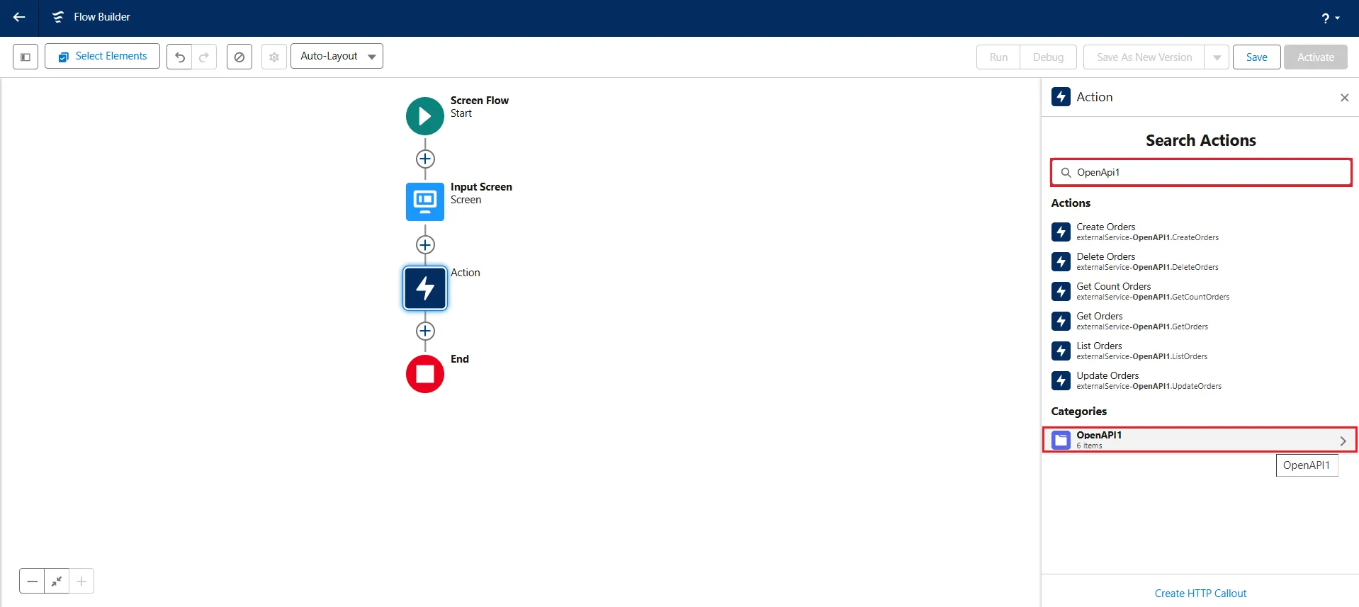 - Under Search Actions, search and click the newly created external service, in this case, OpenAPI1.