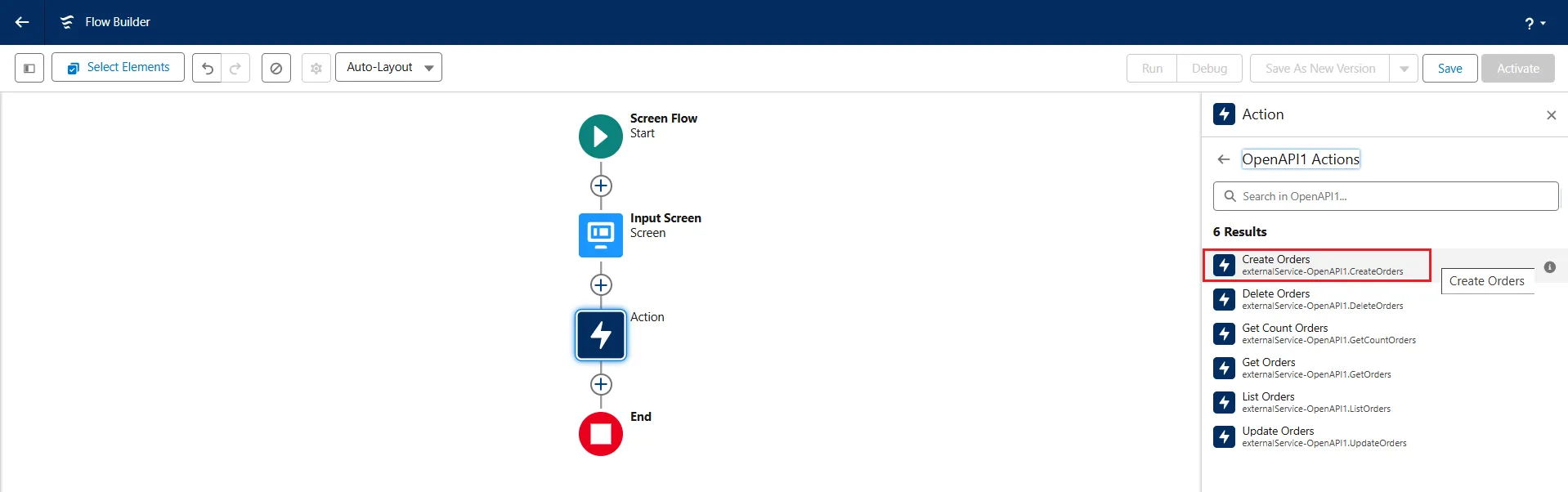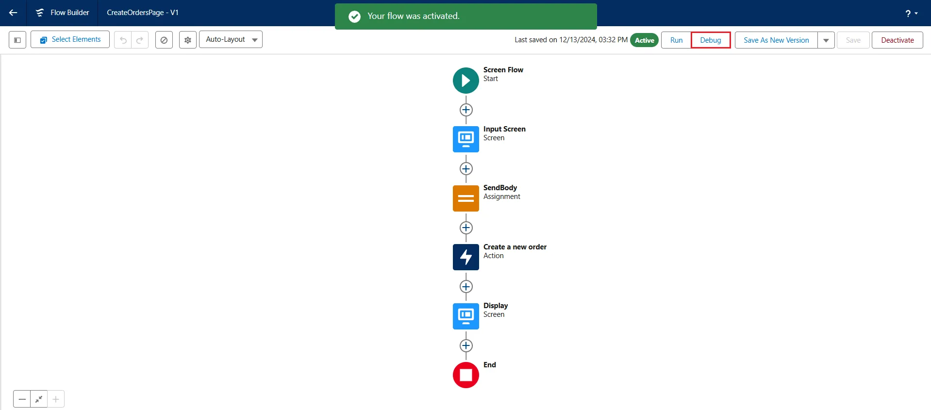 - The flow is displayed on the Flow Builder screen. Click on Activate to activate the flow.
