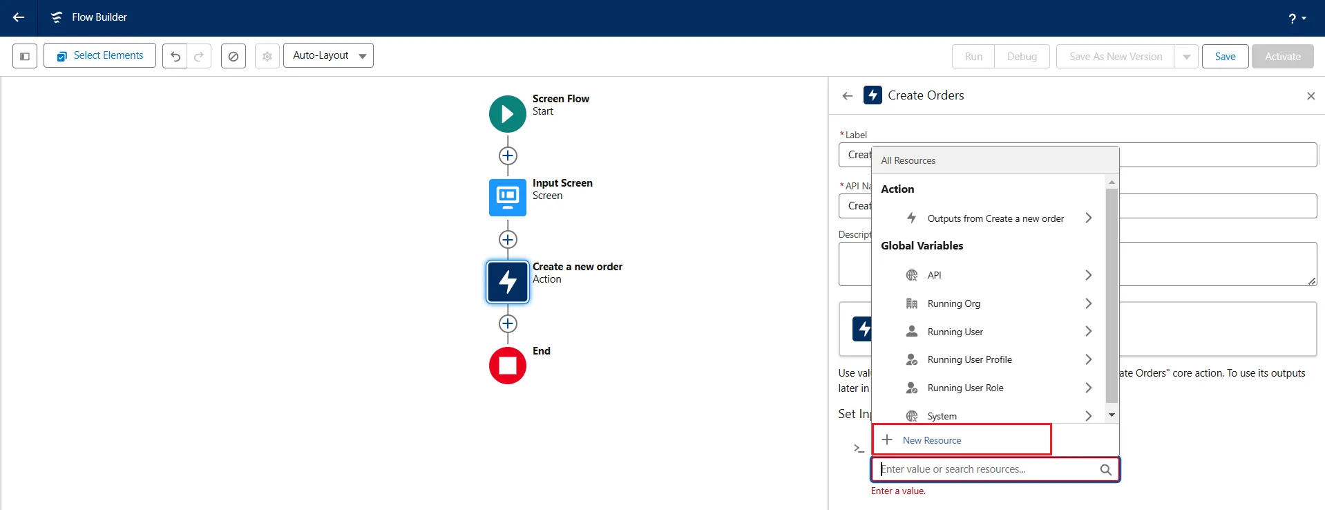 - Click on the search bar under Set Input Values for the Selected Action and select New Resource -> Variable.
