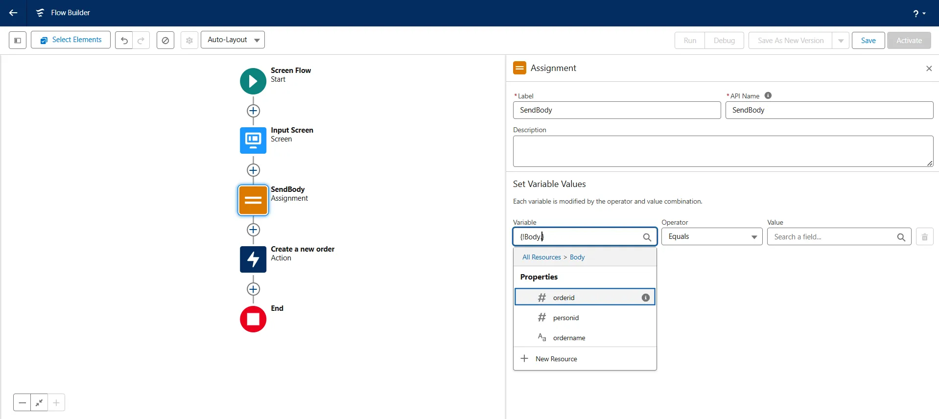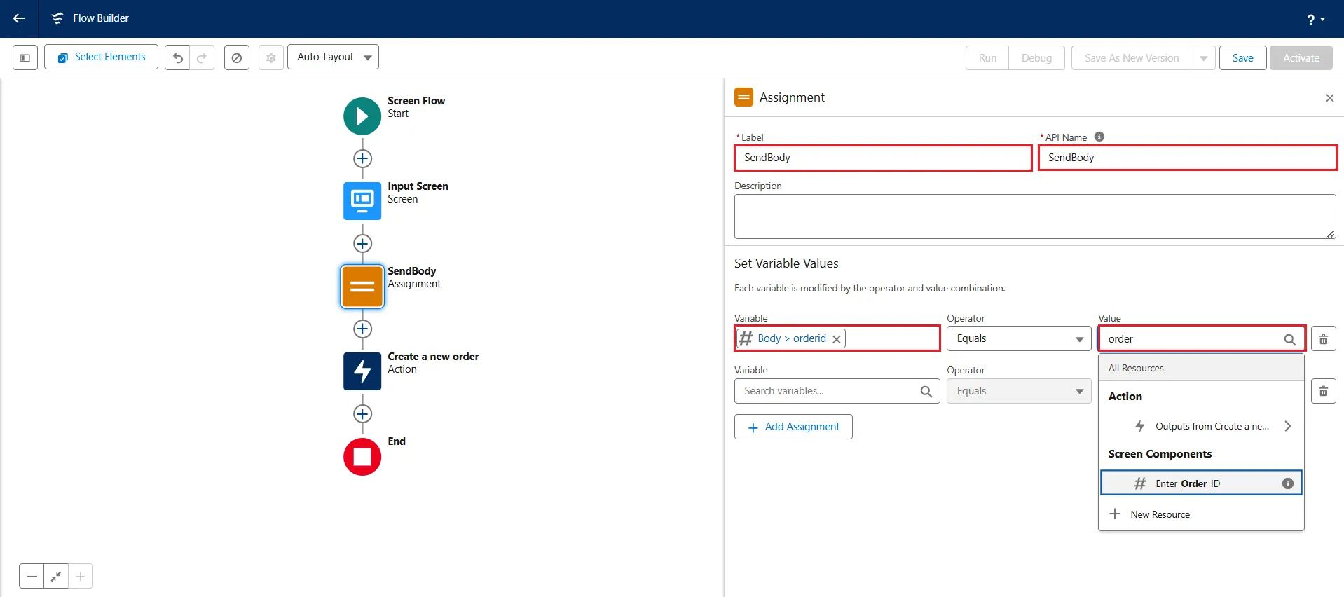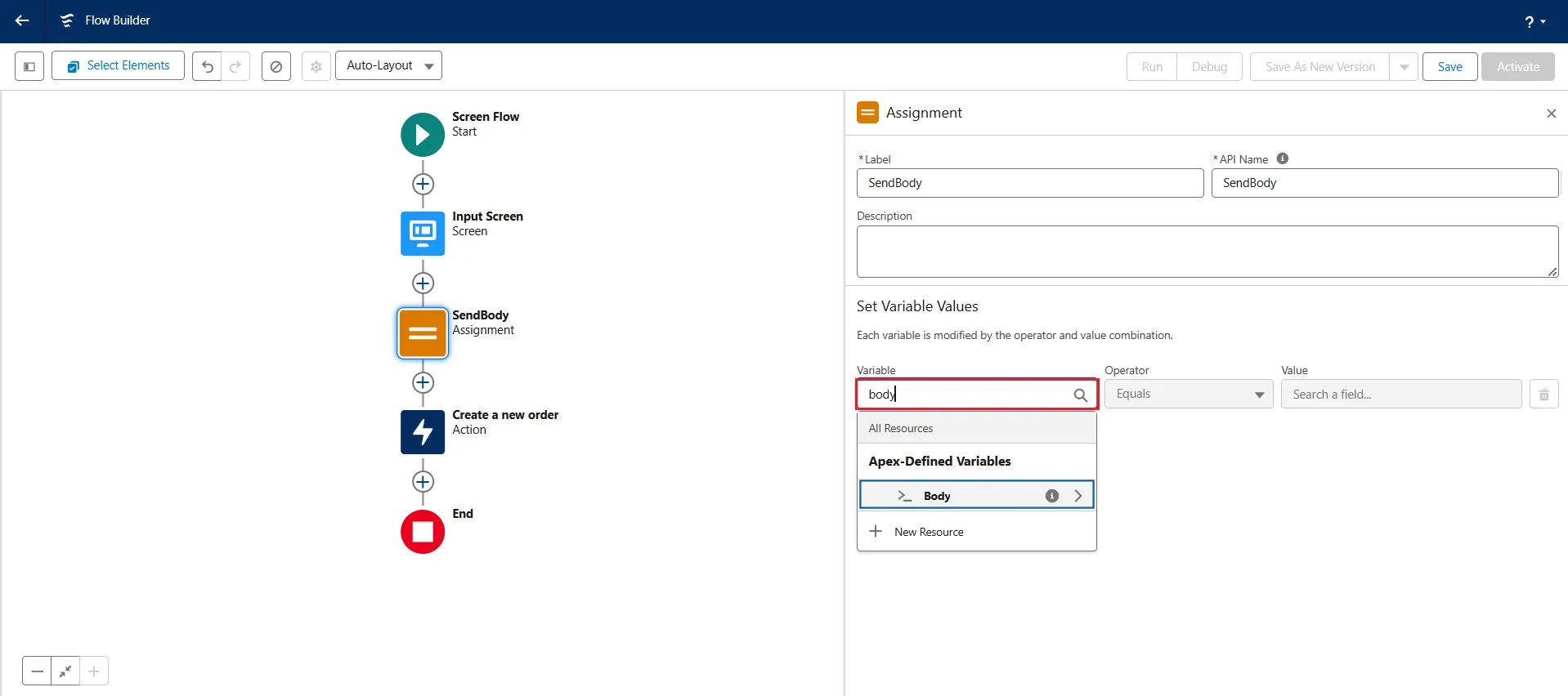 - Add a new element Assignment and add the Label name as "SendBody". Again, the API Name gets auto-filled.