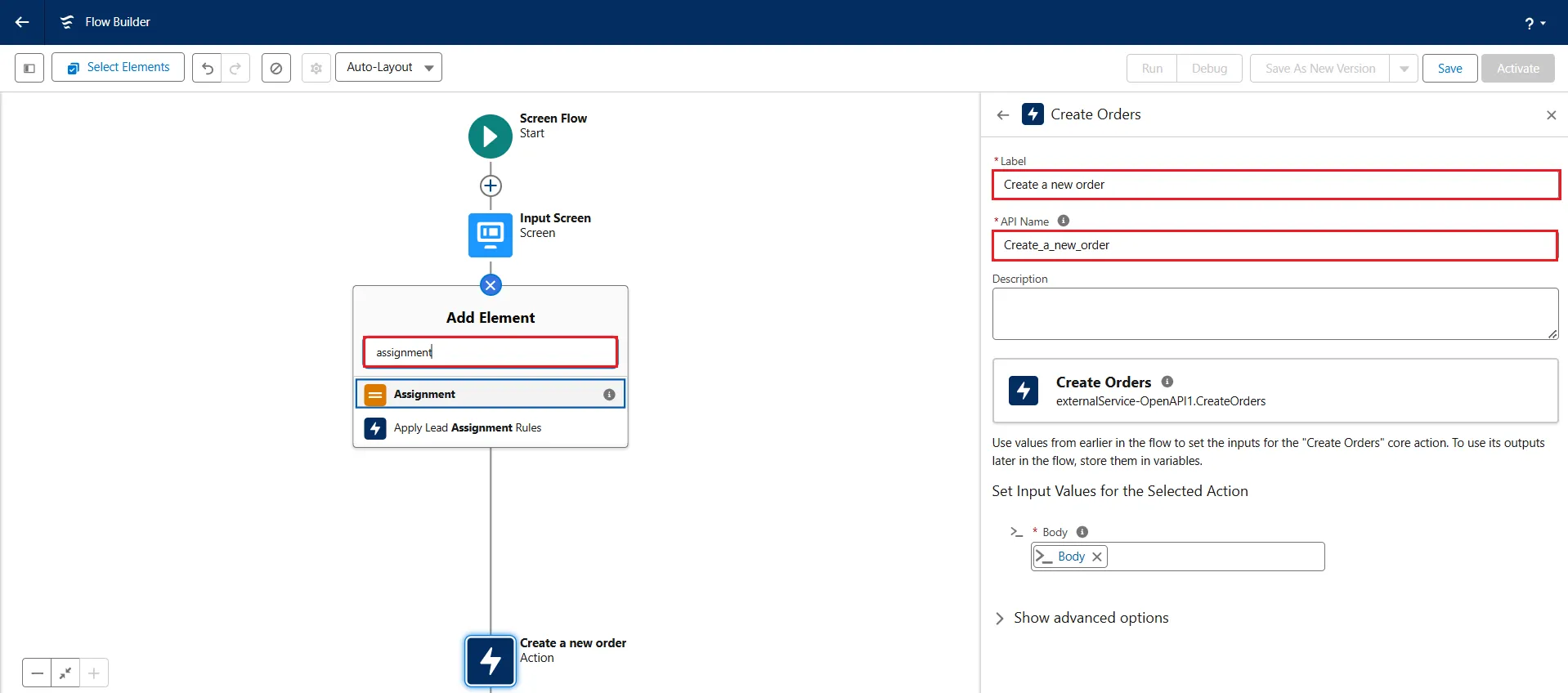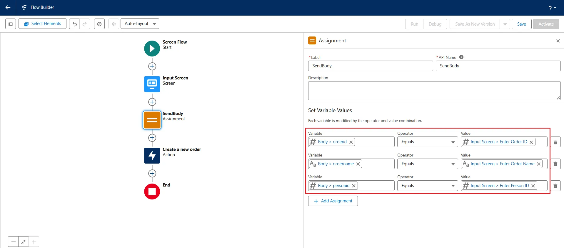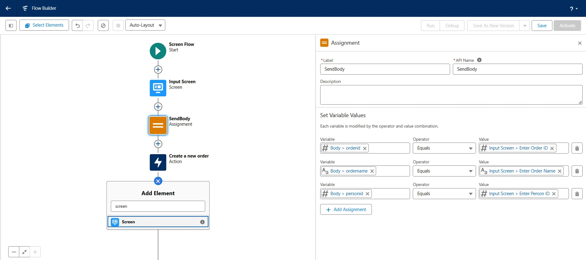 - Add a new element Assignment and add the Label name as "SendBody". Again, the API Name gets auto-filled.