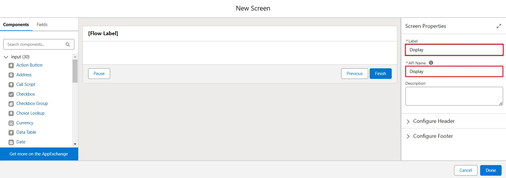 - Click Done and Input Screen will be added in the Flow Builder.