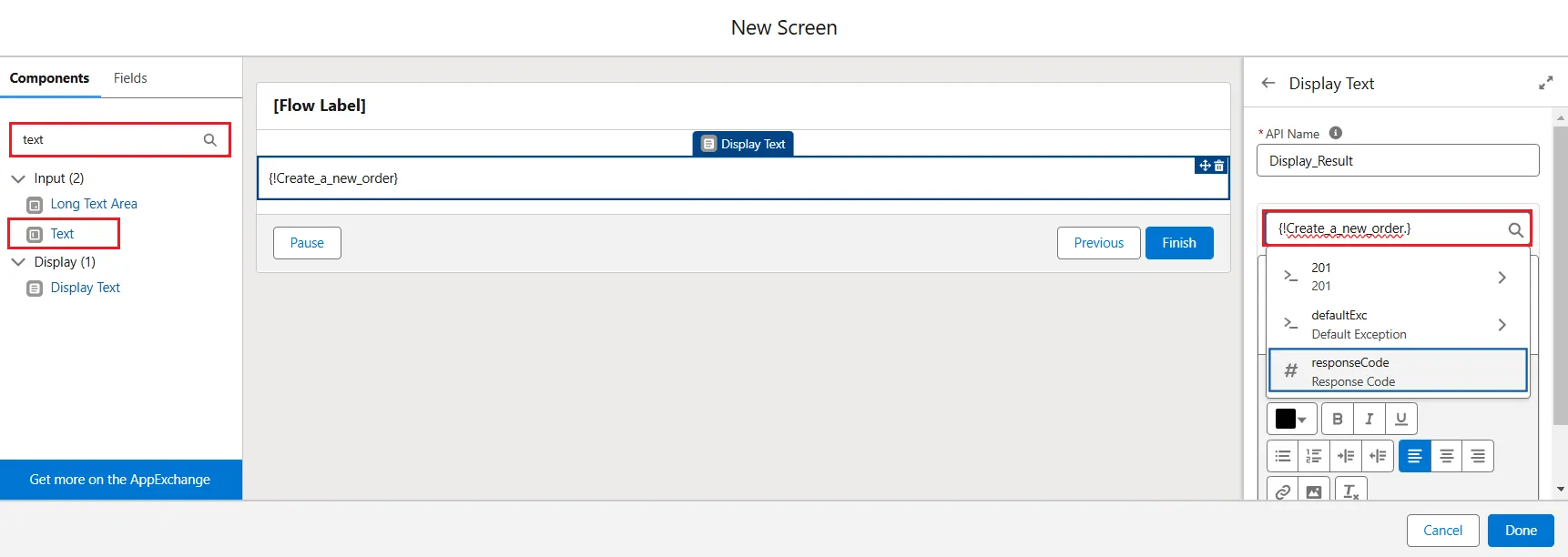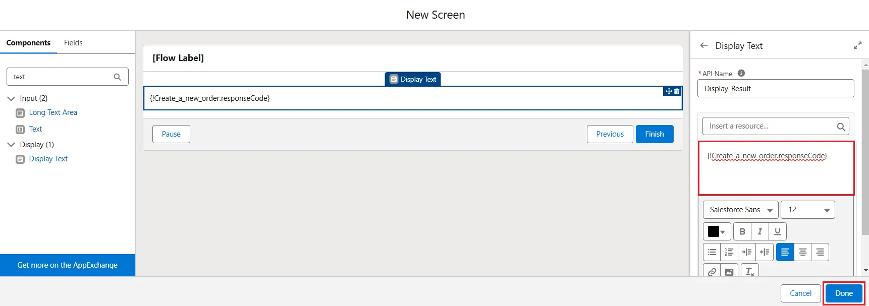 - Set the API Name as "Display_Result" and in the Inside a resource search bar, select Create a new order -> response code. Click Done.