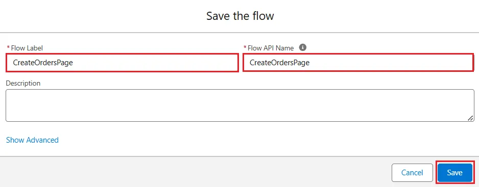 - The flow is now ready. Click Save to save the flow and add a name to the Label as the flow name, in this case, "CreateOrdersPage". Click Save.