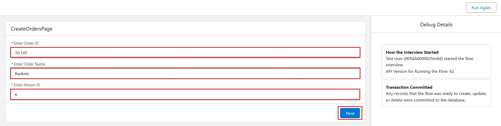 - In the details input page, in this case, "CreateOrdersPage", enter the details (Orders ID, Orders Name, and Person ID) and click Next.