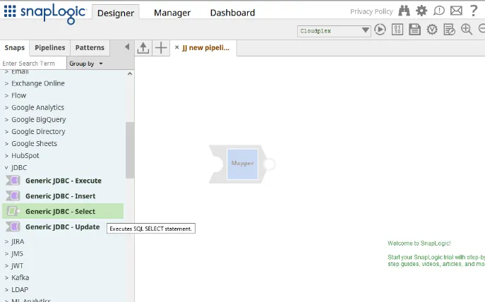 - Click and drag a Generic JDBC - Select "snap" onto the designer.